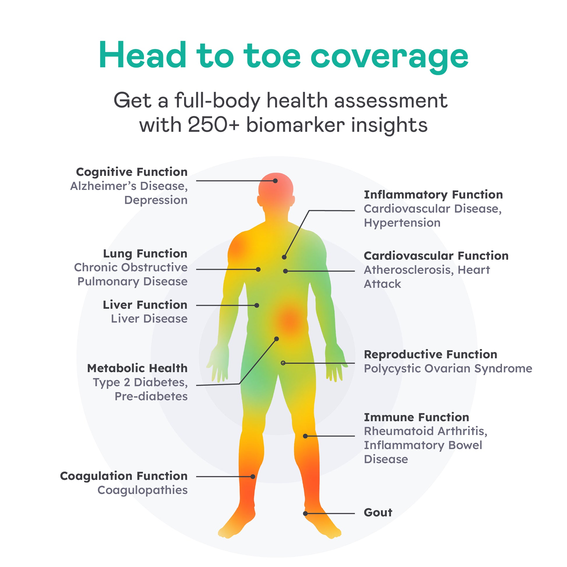 - Head To Toe Coverage - Get a full-body health assessment with insights into 250+ biomarkers